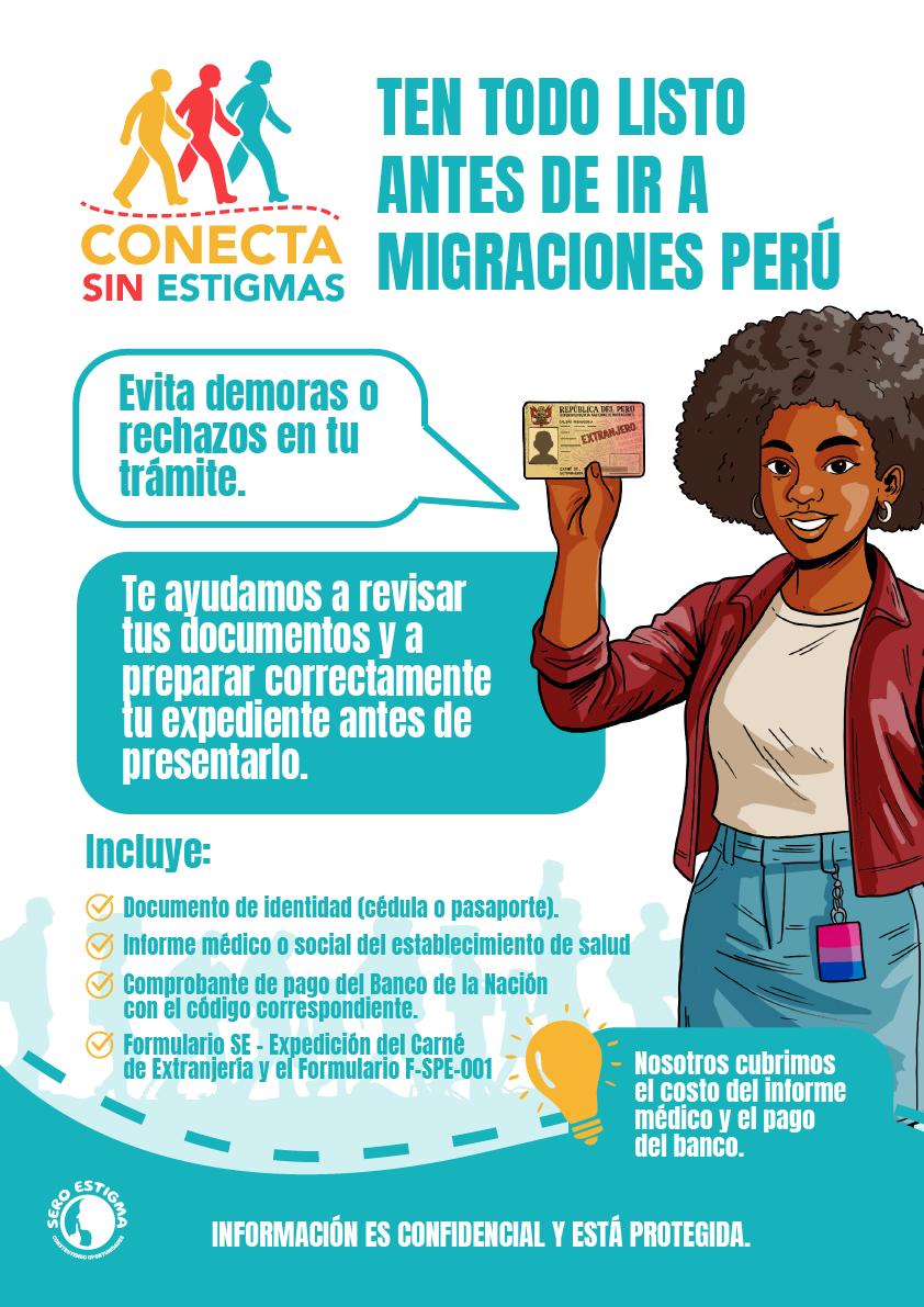 Además, ofrecemos asesoría para la regularización migratoria de personas con VIH o en situación de vulnerabilidad, incluyendo la residencia por razones humanitarias, renovación de carné de extranjería y acompañamiento técnico–comunitario en coordinación con aliados institucionales. Todo el proceso se desarrolla bajo principios de confidencialidad, respeto y enfoque de derechos humanos.